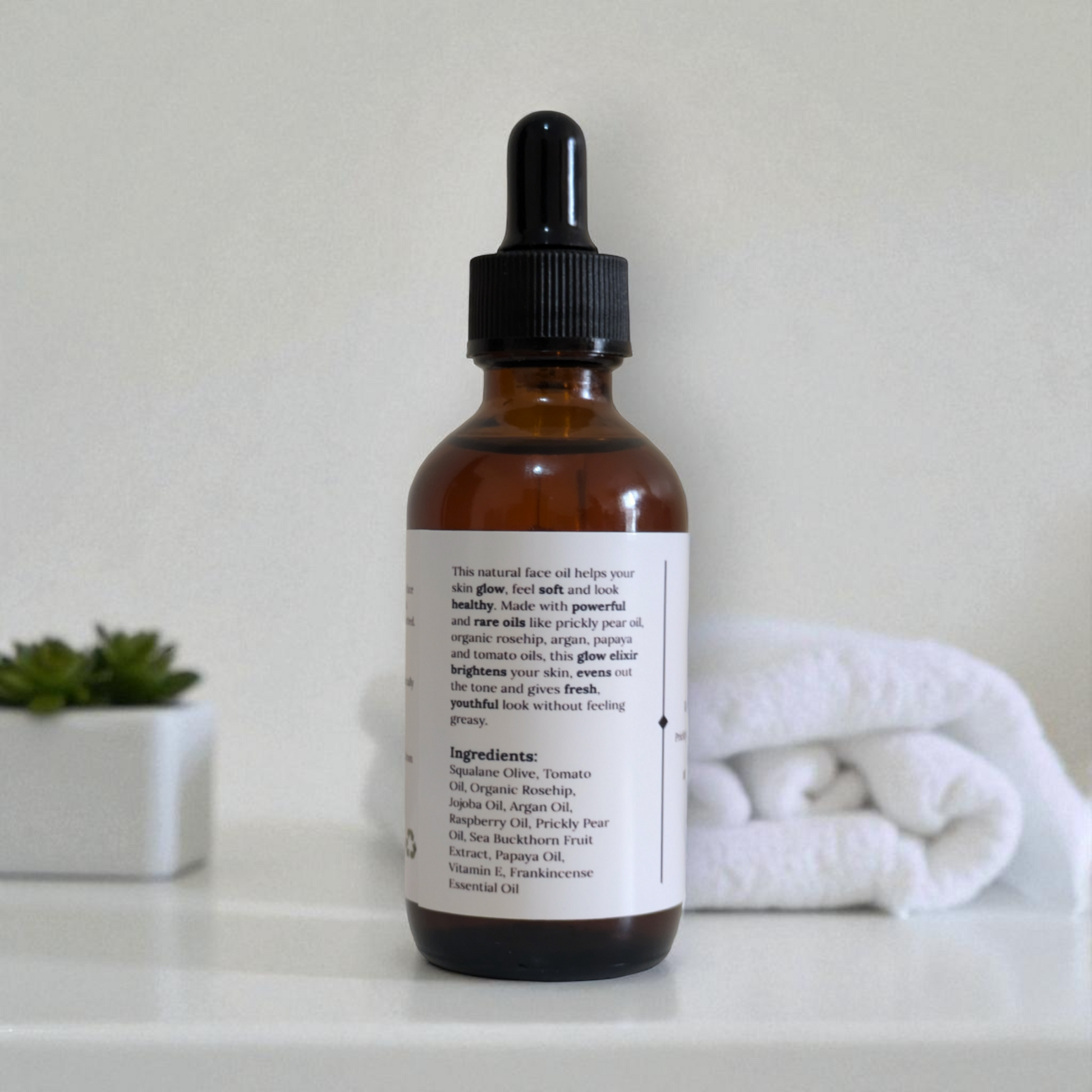 Experience the ultimate in skin nourishment with Fafi Glow Elixir, a lightweight yet powerful blend of rare botanical oils designed to restore, protect, and illuminate your complexion. Crafted with precious prickly pear seed oil, argan oil, papaya oil, rosehip oil, tomato seed oil, jojoba oil, squalane (olive-derived), sea buckthorn fruit extract, vitamin E oil, raspberry oil, and frankincense essential oil, this luxurious elixir delivers a concentrated dose of vitamins, antioxidants, and essential fatty acids to promote youthful, glowing skin.