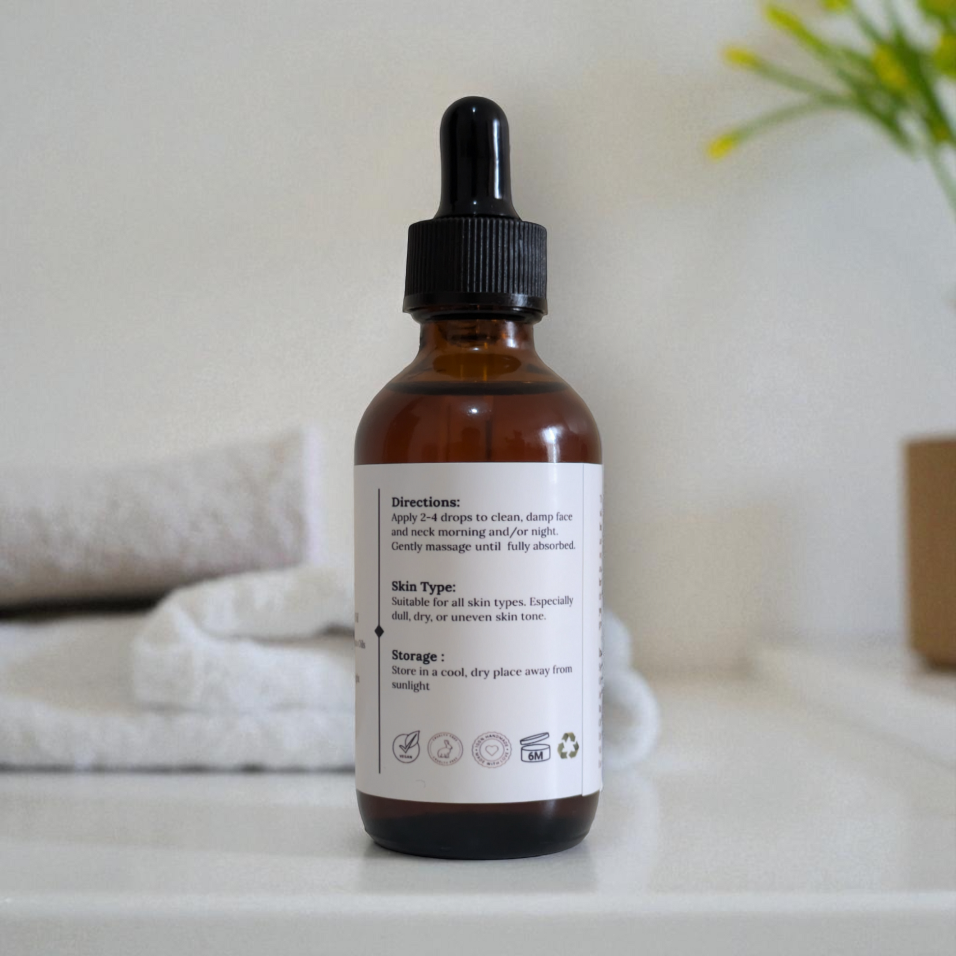 Warm 2–3 drops between your fingertips and gently press into cleansed face and neck. Use morning and evening alone